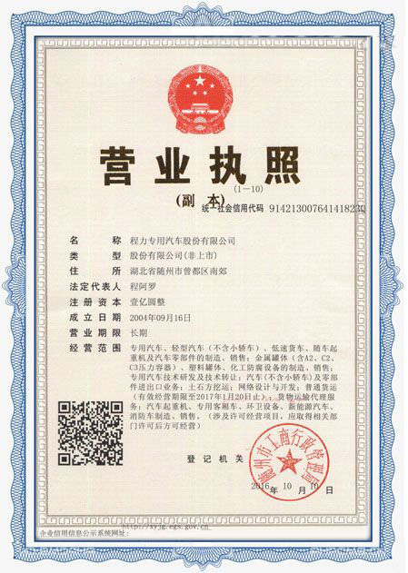 程力專用汽車股份有限公司各類專用汽車的專業(yè)廠家,大型專用汽車廠。國內(nèi)園林綠化、石油化工、市政環(huán)衛(wèi)、壓力容器專用汽車商。注冊“程力威”牌,產(chǎn)品代碼:“CLW”。東風、解放、福田、重汽、陜汽、北奔等公司的重要合作伙伴,主要從事各類專用汽車的業(yè)務,同時也銷售各大型廠家的整車及配件。公司擁有自行出口權(quán),其主導品種有灑水車系列、吸污(吸糞)車系列、垃圾車系列、掃地車系列、油罐加(運)油車系列、高空作業(yè)車系列、清障車系列、隨車吊系列、自卸車系列、教練車系列、半掛車系列、化工車系列、消防車系列、廂式(冷藏車)系列、牽引車系列、粉粒物料車系列、攪拌車系列、壓力容器系列、專用車配件等十八大系列300多個品種車型。同時批發(fā)東風、解放、楚風各種二類底盤。